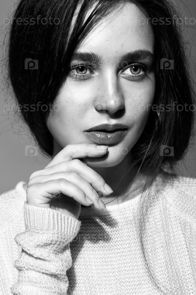 Портрет красивой молодой брюнетки в белом модном женском пуловере
