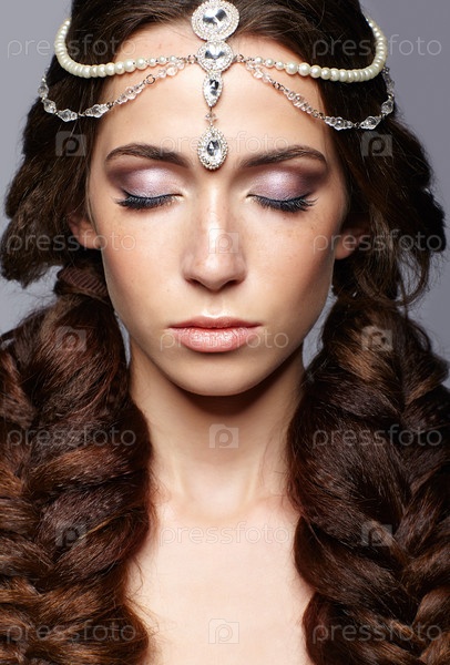 Портрет красоты молодой женщины с диадемой. Брюнетка с длинными косами и дневным женским макияжем на сером фоне