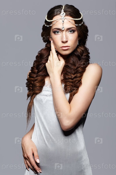 Портрет красоты молодой женщины с диадемой. Брюнетка с длинными косами и дневным женским макияжем на сером фоне