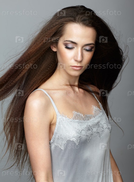Портрет красоты молодой женщины. Брюнетка с длинными растрепанными развевающимися волосами и дневным женским макияжем на сером фоне