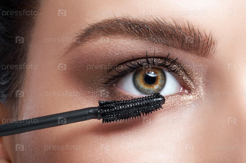 Крупный план молодой женщины, наносящей тушь на ресницы косметической кистью