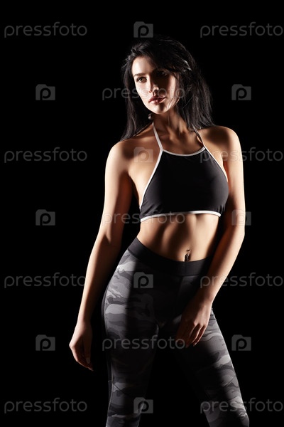 Портрет молодой брюнетки спортивной фитнес-женщины на черном