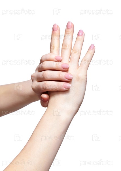 Женские руки с женским профессиональным натуральным розовым маникюром ногтей на белом