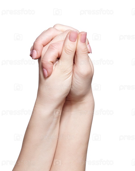 Женские руки с женским профессиональным натуральным розовым маникюром ногтей на белом