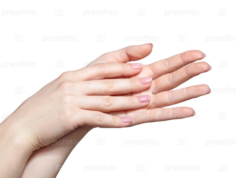 Женские руки с женским профессиональным натуральным розовым маникюром ногтей на белом
