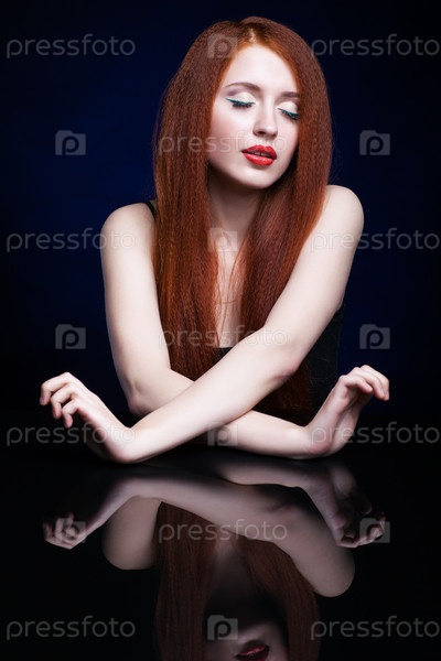 Молодая женщина с рыжими волосами над зеркалом отражения на синем фоне