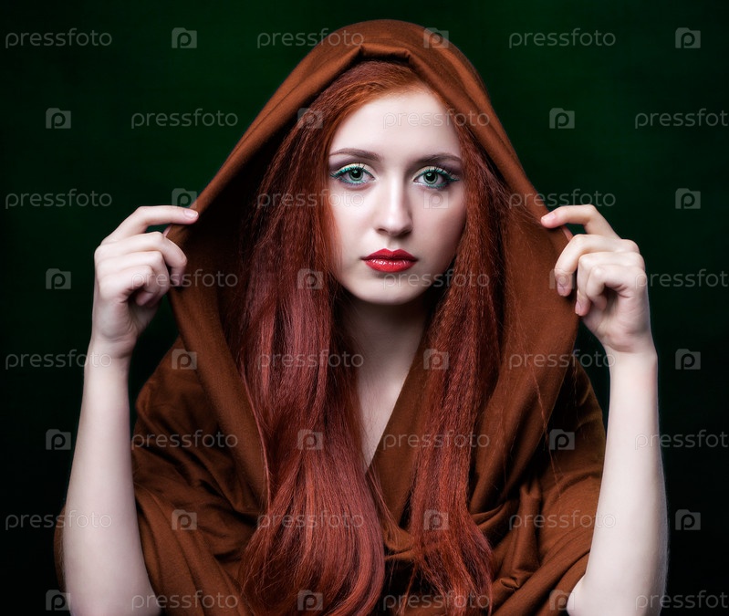 Молодая женщина с рыжими волосами и шарфом на зеленом фоне
