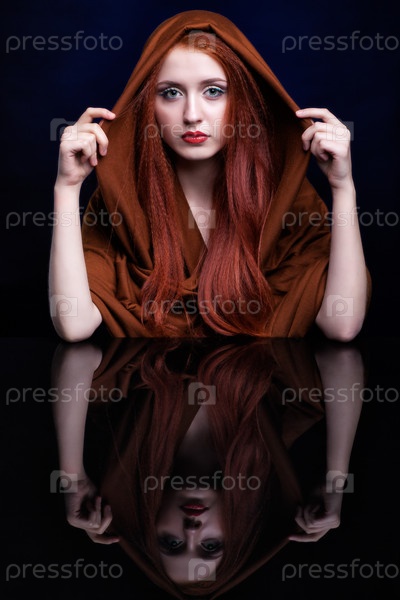 Молодая женщина с рыжими волосами и шарфом над зеркалом отражения на синем фоне