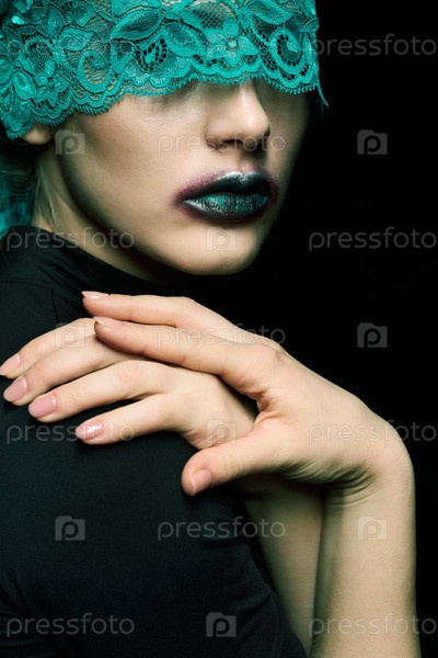 Хэллоуин красота портрет молодой красивой женщины с зеленой кружевной лентой на глазах на черном