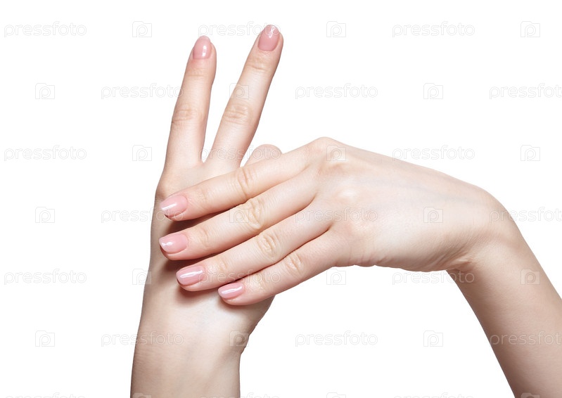 Женские руки с женским профессиональным натуральным розовым маникюром ногтей на белом