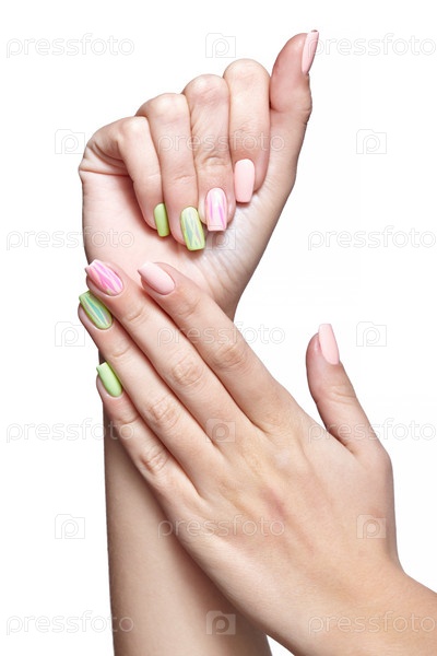 Женские руки с женским профессиональным натуральным розовым и зеленым маникюром ногтей на белом