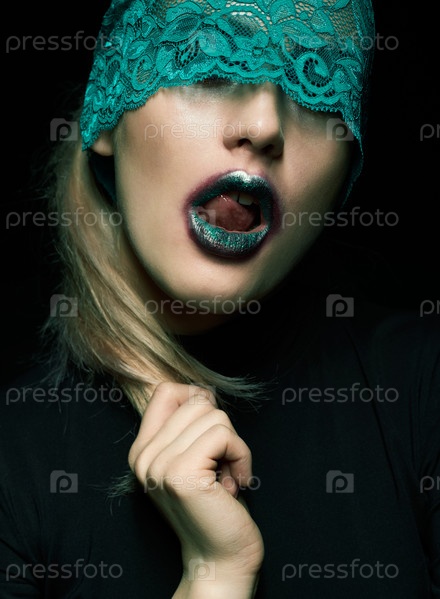 Хэллоуин красота портрет молодой красивой женщины с зеленой кружевной лентой на глазах на черном