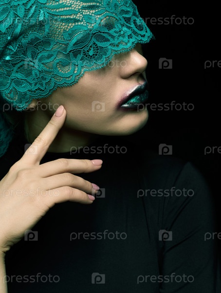 Хэллоуин красота портрет молодой красивой женщины с зеленой кружевной лентой на глазах на черном