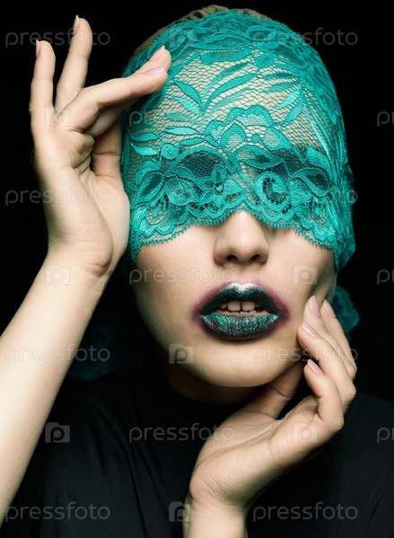 Хэллоуин красота портрет молодой красивой женщины с зеленой кружевной лентой на глазах на черном