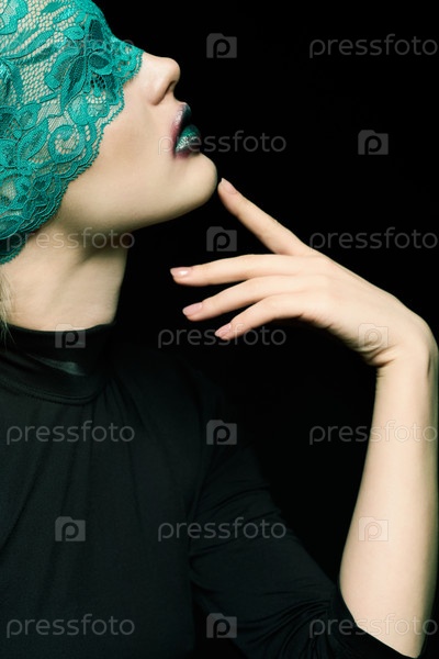 Хэллоуин красота портрет молодой красивой женщины с зеленой кружевной лентой на глазах на черном