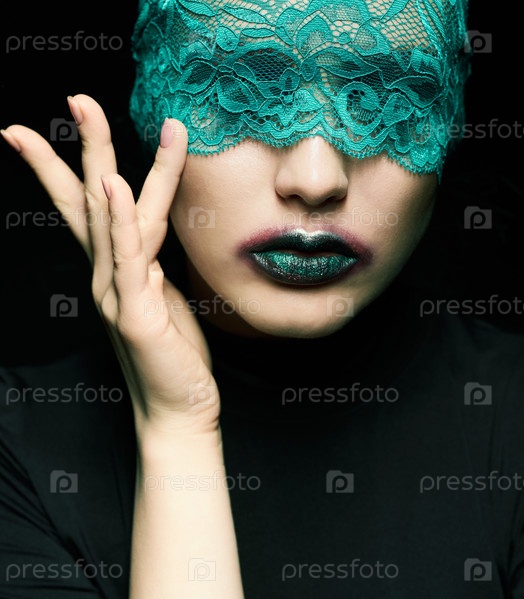 Хэллоуин красота портрет молодой красивой женщины с зеленой кружевной лентой на глазах на черном