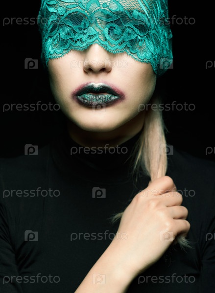 Хэллоуин красота портрет молодой красивой женщины с зеленой кружевной лентой на глазах на черном