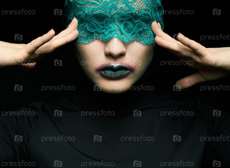 Хэллоуин красота портрет молодой красивой женщины с зеленой кружевной лентой на глазах на черном