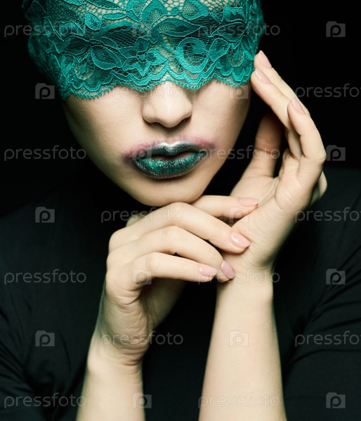 Хэллоуин красота портрет молодой красивой женщины с зеленой кружевной лентой на глазах на черном