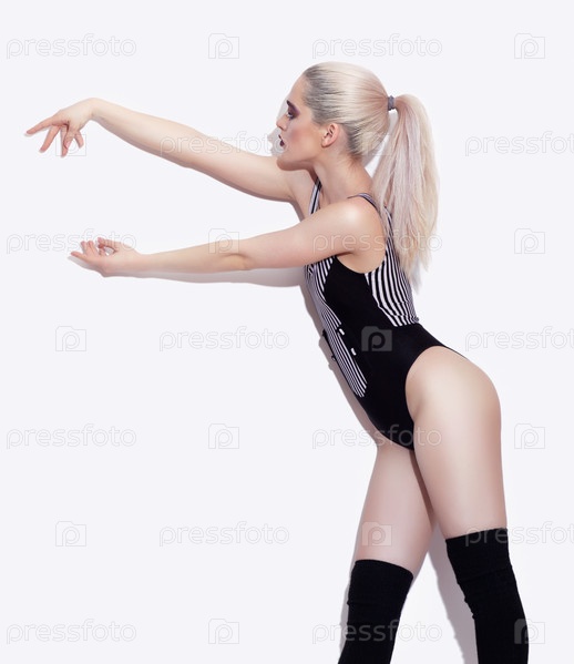 Портрет молодой красивой женщины, одетой в полосатый купальник, позирующей у стены