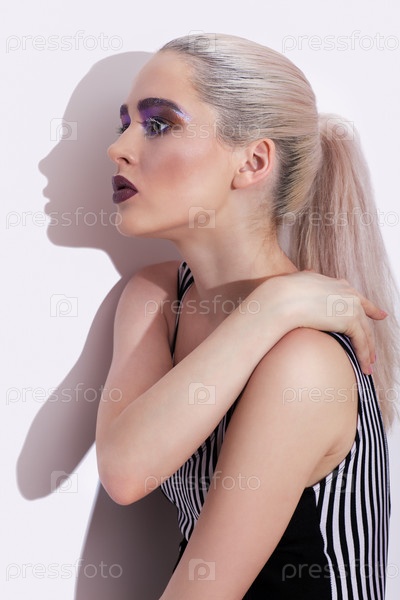 Портрет молодой красивой женщины с зелеными фисташковыми дымчатыми глазами в полосатом купальнике, позирующей у стены