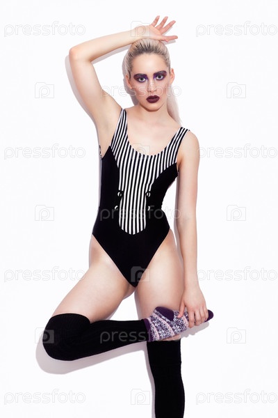 Портрет молодой красивой женщины, одетой в полосатый купальник, позирующей у стены
