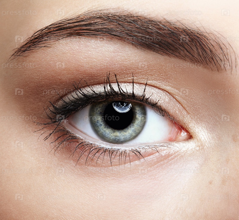 Крупным планом макро портрет женского лица. Человеческий глаз девушки с дневным макияжем. Женщина с идеальной кожей и веснушками