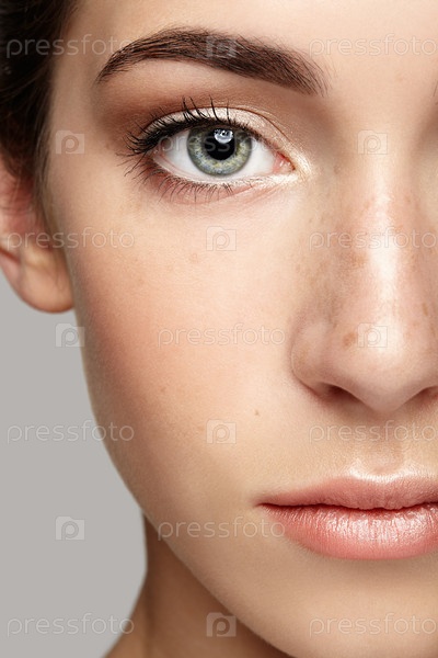 Крупным планом макро портрет женского лица. Половина лица женщины с дневным макияжем. Девушка с идеальной кожей и веснушками