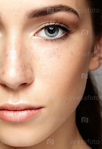Крупным планом макро портрет женского лица. Половина лица женщины с дневным макияжем. Девушка с идеальной кожей и веснушками