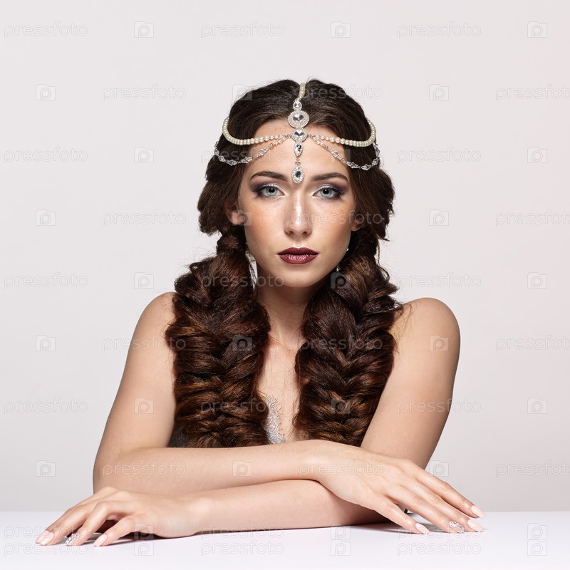 Красота портрет молодой женщины в жемчужной диадеме. Брюнетка с косами, прической и дневным женским макияжем сидит за белым столом