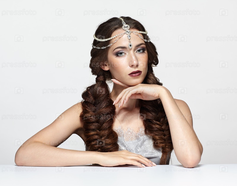 Красота портрет молодой женщины в жемчужной диадеме. Брюнетка с косами, прической и дневным женским макияжем сидит за белым столом