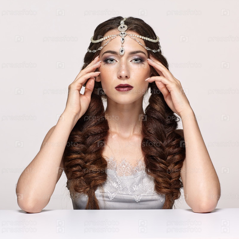 Красота портрет молодой женщины в жемчужной диадеме. Брюнетка с косами, прической и дневным женским макияжем сидит за белым столом