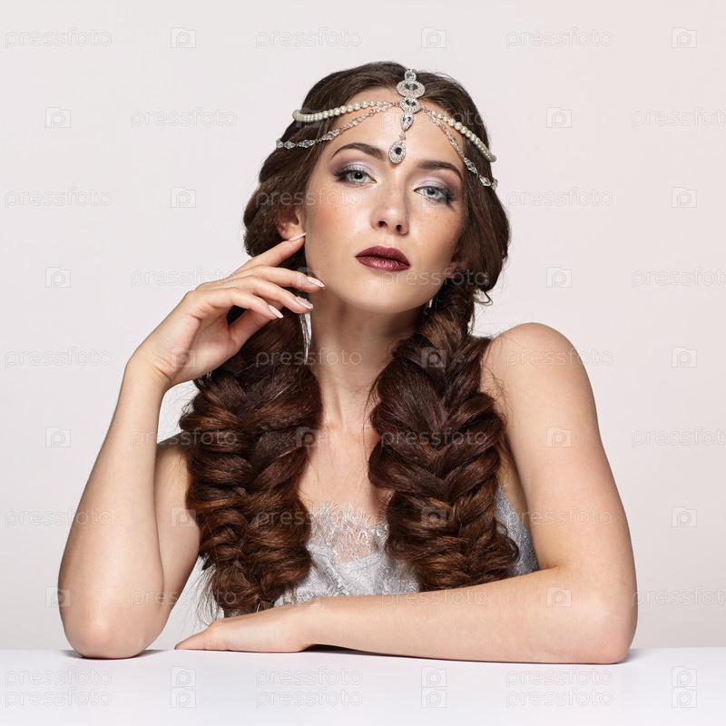 Красота портрет молодой женщины в жемчужной диадеме. Брюнетка с косами, прической и дневным женским макияжем сидит за белым столом