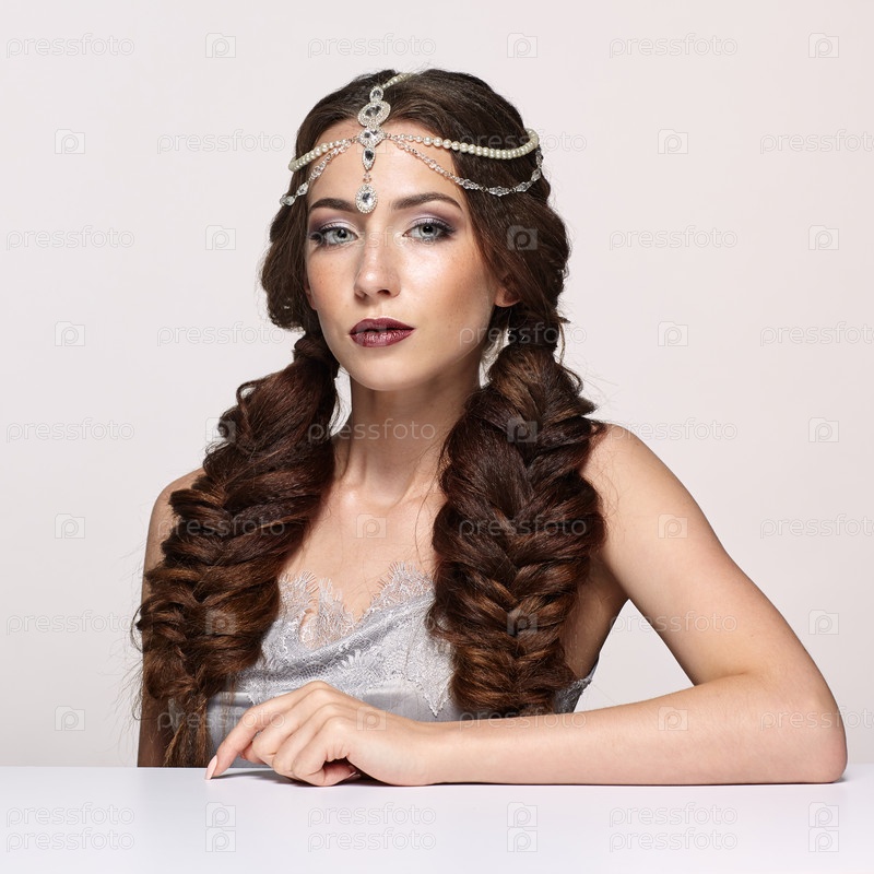 Красота портрет молодой женщины в жемчужной диадеме. Брюнетка с косами, прической и дневным женским макияжем сидит за белым столом