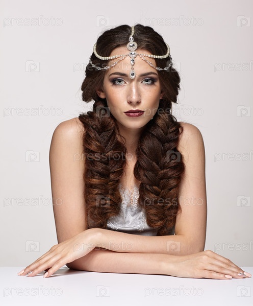 Красота портрет молодой женщины в жемчужной диадеме. Брюнетка с косами, прической и дневным женским макияжем сидит за белым столом