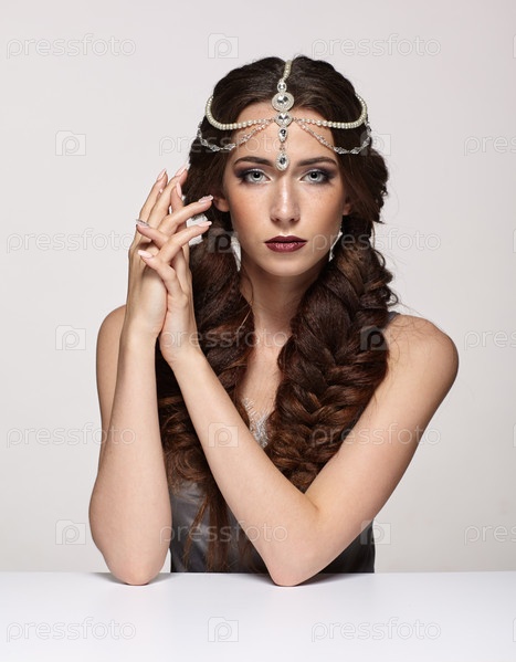 Красота портрет молодой женщины в жемчужной диадеме. Брюнетка с косами, прической и дневным женским макияжем сидит за белым столом