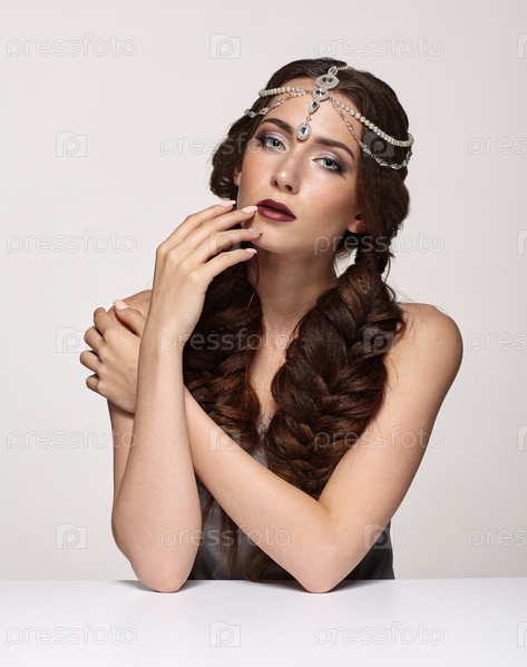 Красота портрет молодой женщины в жемчужной диадеме. Брюнетка с косами, прической и дневным женским макияжем сидит за белым столом