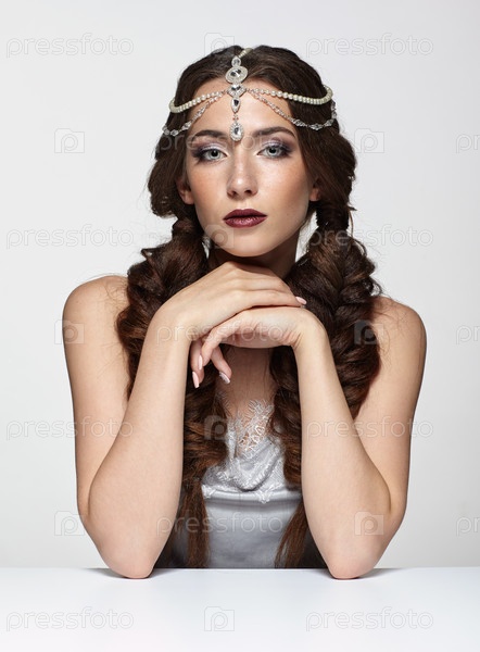 Красота портрет молодой женщины в жемчужной диадеме. Брюнетка с косами, прической и дневным женским макияжем сидит за белым столом