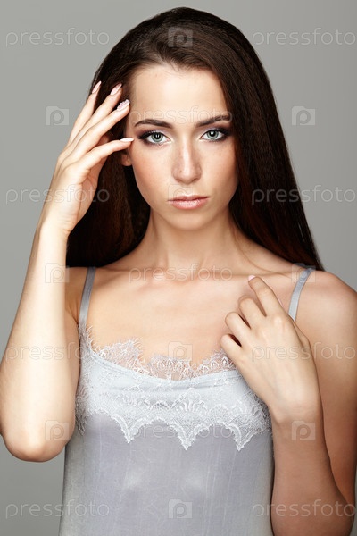 Портрет красоты молодой женщины. Брюнетка с длинными волосами и дневным женским макияжем на сером фоне