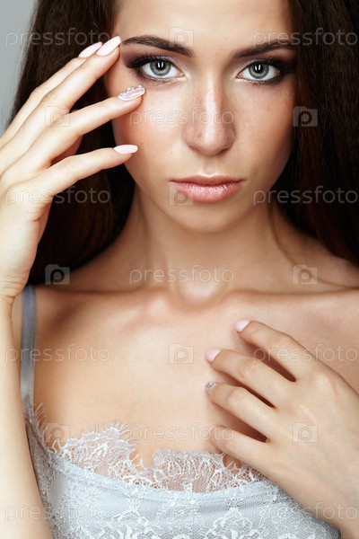 Портрет красоты молодой женщины, касающейся лица пальцами. Брюнетка с длинными волосами и дневным женским макияжем