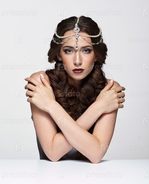 Красота портрет молодой женщины в жемчужной диадеме. Брюнетка с косами, прической и дневным женским макияжем сидит за белым столом