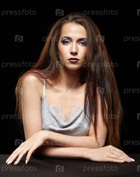 Портрет красоты молодой женщины сидит за черным столом. Брюнетка с длинными волосами и вечерним женским макияжем на темном фоне