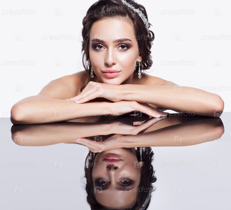 Портрет молодой красивой брюнетки, сидящей за зеркальным столом