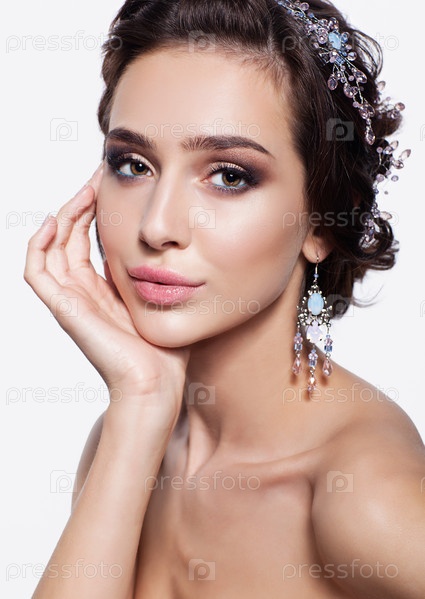 Портрет красивой молодой брюнетки с рукой возле лица