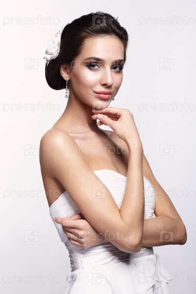 Портрет красивой молодой невесты брюнетки в белом свадебном платье