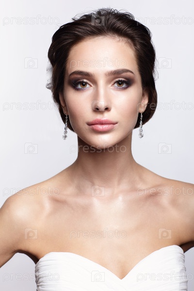 Портрет красивой молодой невесты брюнетки в белом свадебном платье