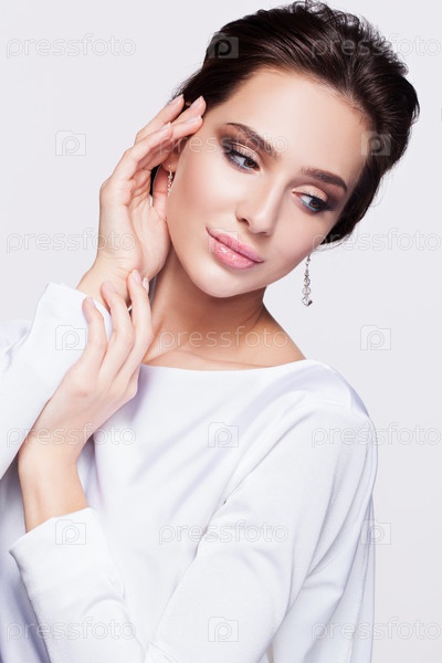 Портрет красивой молодой брюнетки невесты в белом свадебном платье на светло-сером фоне