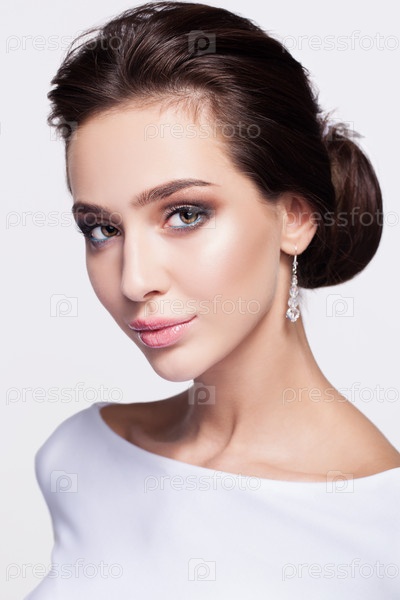 Портрет красивой молодой невесты брюнетки в белом свадебном платье