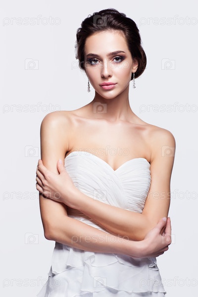 Портрет красивой молодой брюнетки невесты в белом свадебном платье на светло-сером фоне