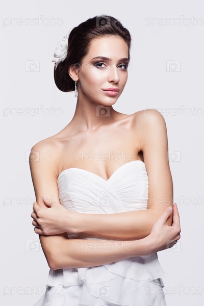 Портрет красивой молодой брюнетки невесты в белом свадебном платье на светло-сером фоне